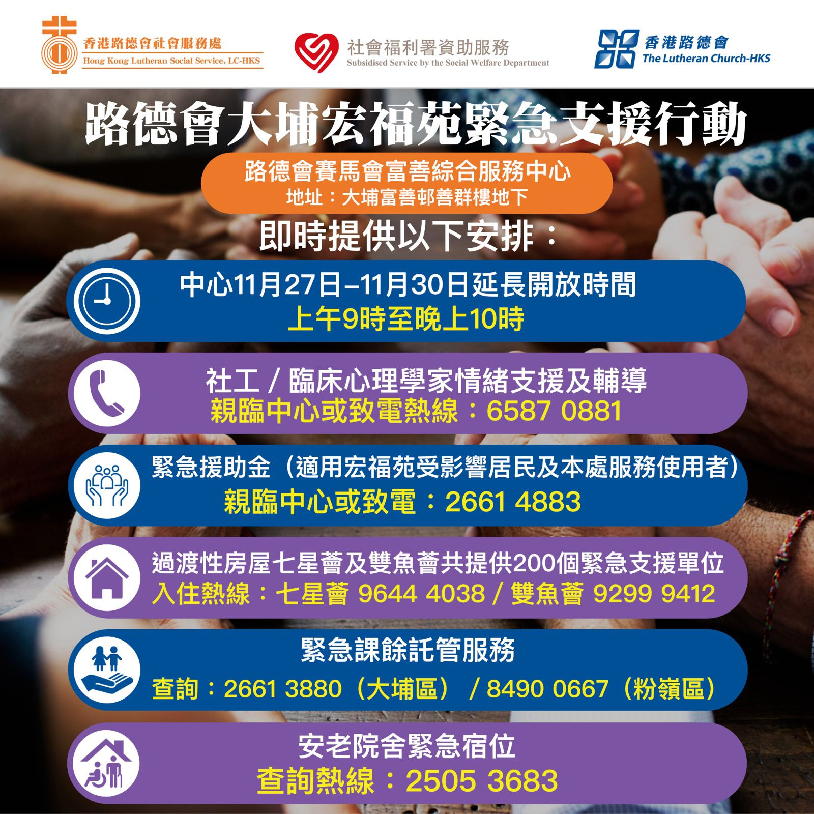 我哋位於大埔富善邨善群樓地下嘅路德會賽馬會富善綜合服務中心,會即時提供以下安排: